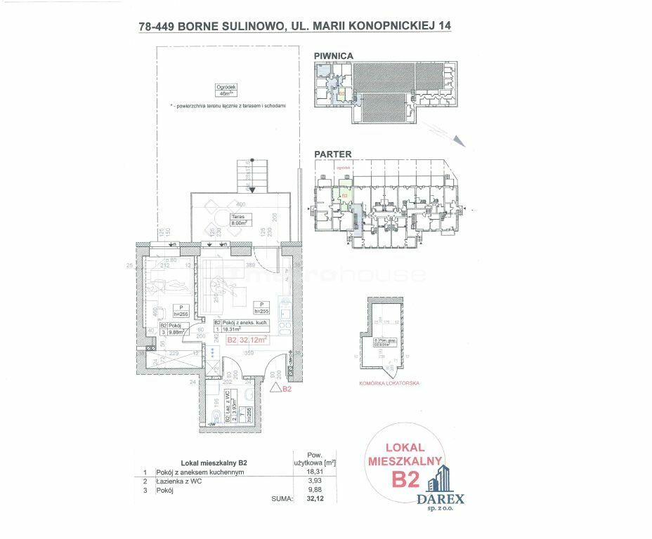 APARTAMENT 14/B2 pow. 32,12 m2 (piwnica 8,01 m2) składający się z salonu z aneksem kuchennym, 1 sypialni, łazienki. Zlokalizowany na parterze z tarasem o pow. 8 m2 i ogrodem 46 m2. Piwnica 8,01 m2
