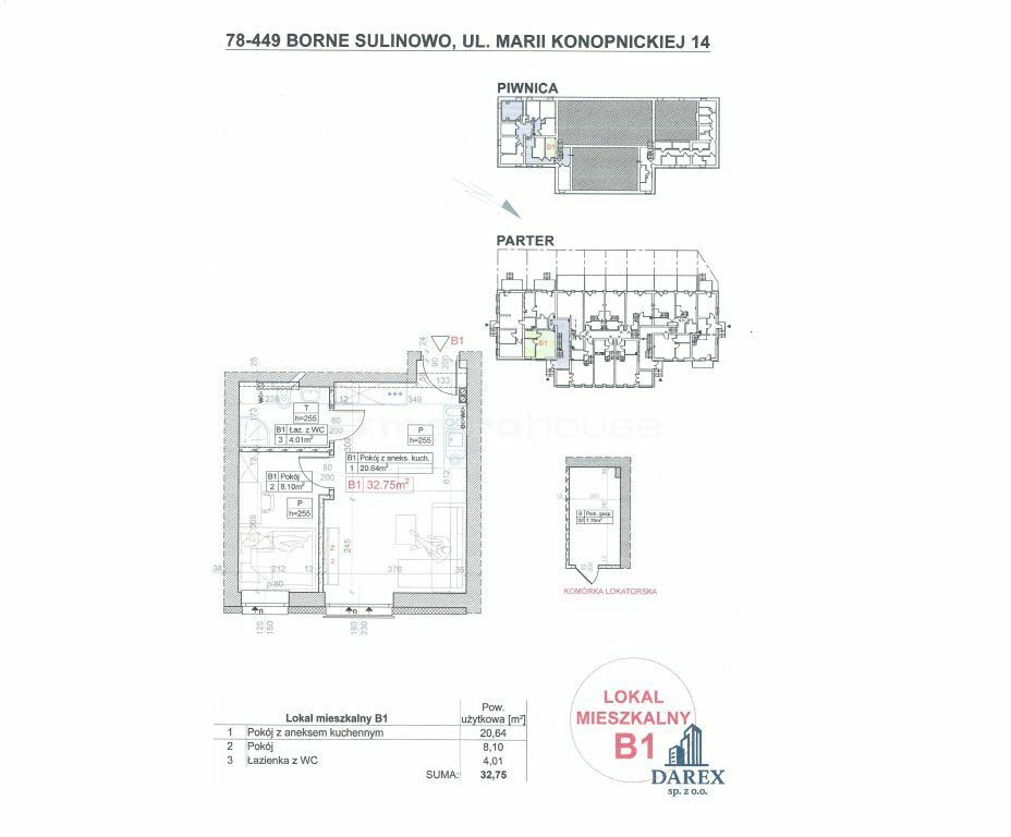 APARTAMENT 14/B1 pow. 32,75 użytkowej ( piwnica 7,76 m2 ) składający się z salonu z aneksem kuchennym, 1 sypialni, łazienki. Zlokalizowany na parterze.