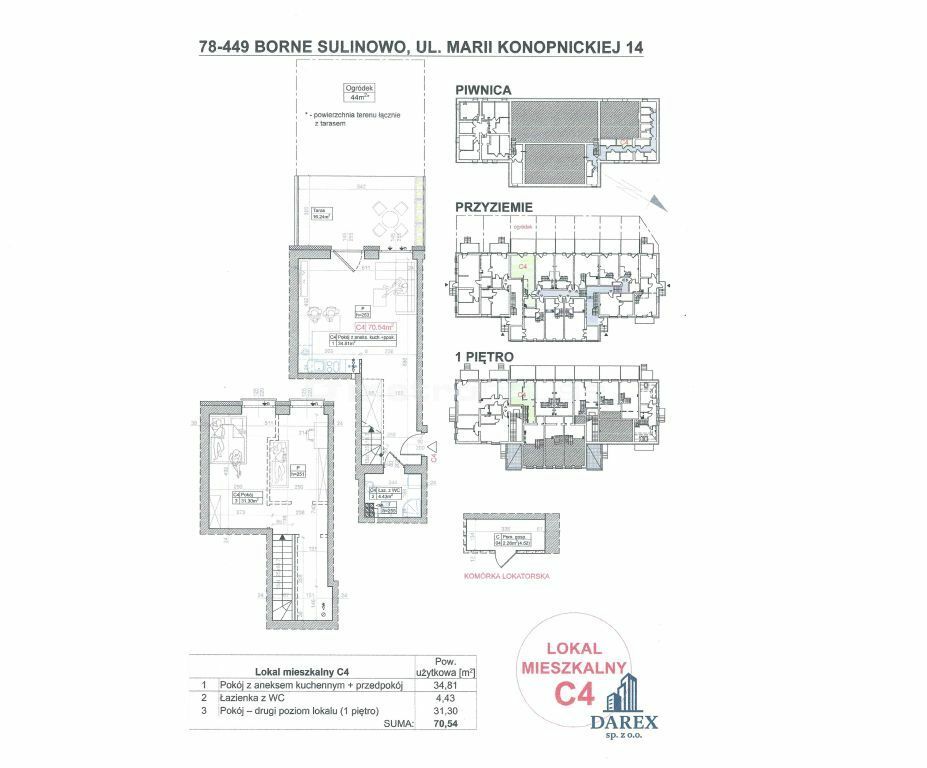 APARTAMENT 14/C4 pow. użytkowa 70,54 ( piwnica 2,26 m2 ) dwupoziomowy położony na parterze składający się z salonu z aneksem kuchennym i łazienki z wc oraz pokoju na drugim poziomie o pow. 31,30 m2 z możliwością podziału na osobne 2 pokoje. Apartament posiada taras o pow. 16,24 m2 oraz ogród 44 m2.