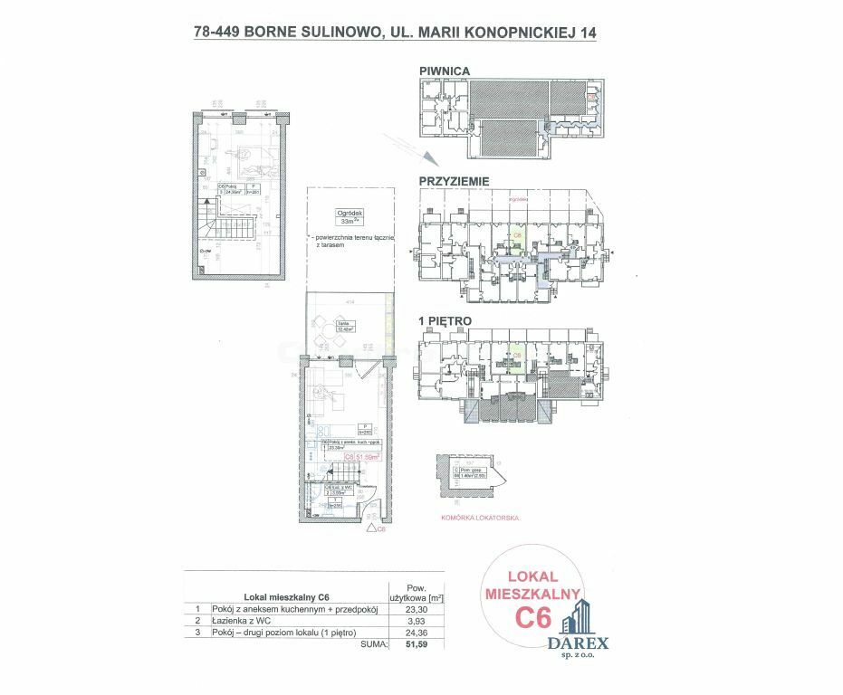 APARTAMENT 14/C6 pow. użytkowa 51,59 ( piwnica 1.46 m2 ) dwupoziomowy położony na parterze składający się z salonu z aneksem kuchennym i łazienki z wc oraz pokoju na drugim poziomie o pow. 24,36 m2. Apartament posiada taras o pow. 12,42 m2 oraz ogród 33 m2.