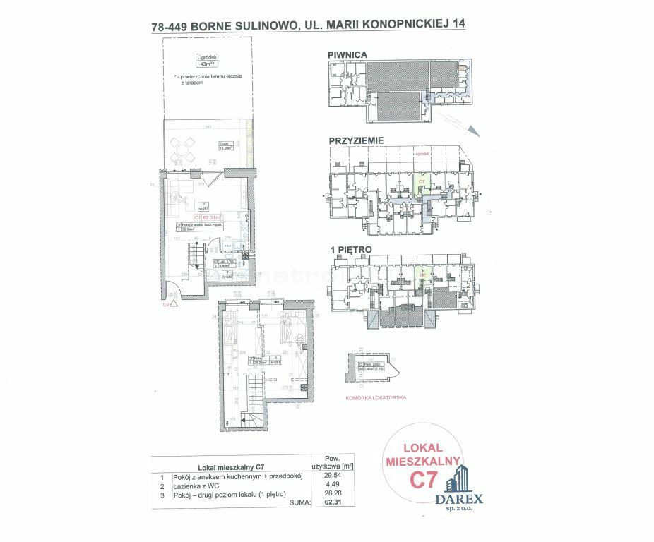 APARTAMENT 14/C6 pow. użytkowa 62,31 ( piwnica 1,46 m2 ) dwupoziomowy położony na parterze składający się z salonu z aneksem kuchennym i łazienki z wc oraz pokoju na drugim poziomie o pow. 28,28 m2 z możliwością podziału na 2 osobne pokoje. Apartament posiada taras o pow. 16,28 m2 oraz ogród 43 m2.